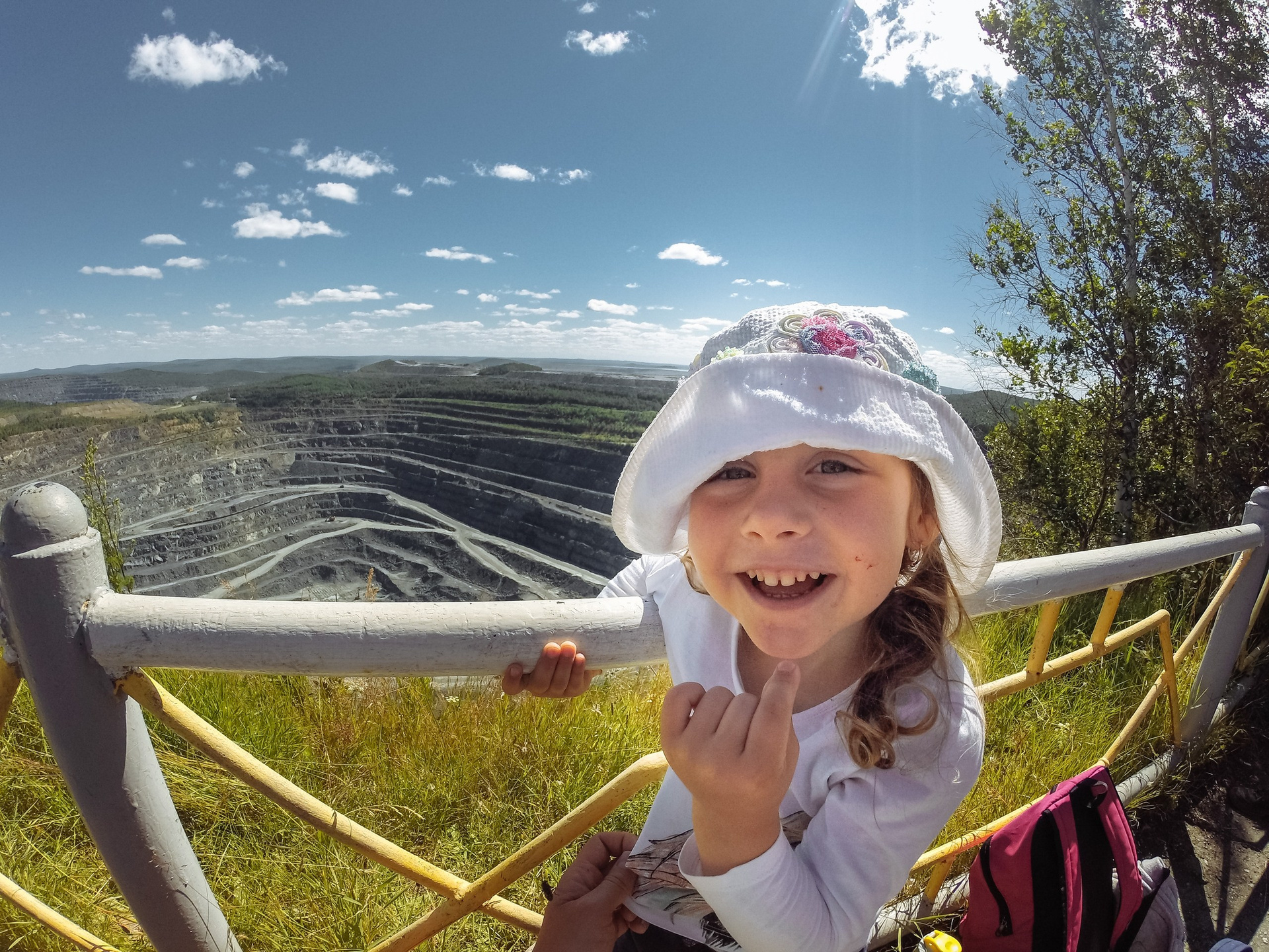 Погода была хорошая, но наверху дул холодный ветер — как в холодильнике, когда долго стоишь с открытой дверцей. По дороге нам попался огромный железный карьер. Я никогда не видела ничего подобного! Это была огромная дыра в земле, а на дне ползали маленькие, как игрушечные, самосвалы. Папа сказал: это карьер, где добывают железо. Было немножко страшно и очень красиво.